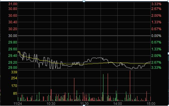 2011年11月23日臨近收盤期間(14:56:24至14:59:28),任某某為了在短期內(nèi)拉升股價,大量申報買入“X”4筆共計63,000股,占尾市階段市場申買量的比例高達75.54%;委托價格由29.60元升至32.00元,每筆均高于當(dāng)時市場上的買1檔價格,三分鐘內(nèi)將股價由29.35元拉升至30元收盤,拉升幅度達2.21%。(見下圖)